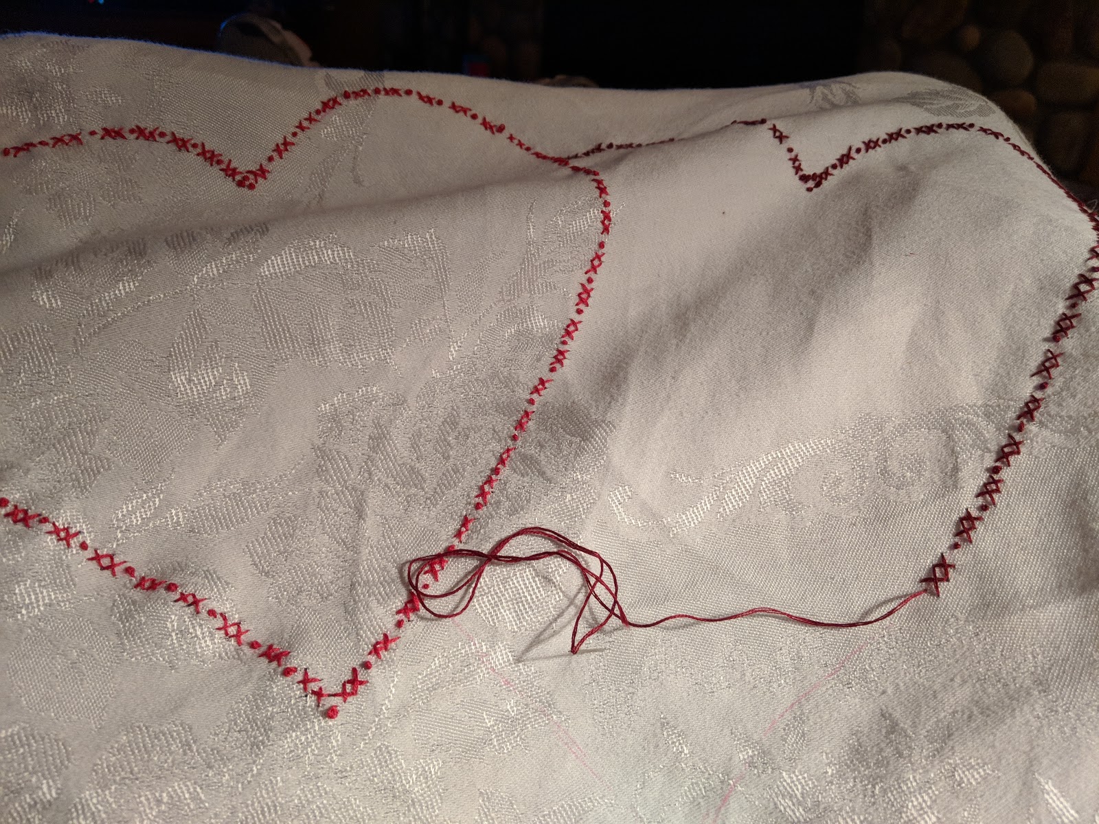 I'm also working on a "Midling" which will be about the size of a fat quarter, which is on my design wall waiting for the next level of inspiration. I am embroidering on a vintage damask tablecloth. I love the way the damask adds texture to the background.