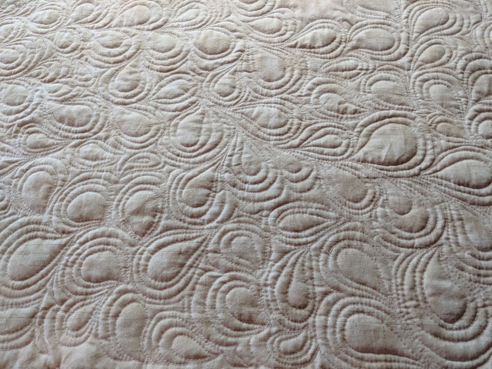 I've been following some blogs and watching videos on free motion quilting this summer. I jumped in on the paisley design in the center. Here is a closer picture of the back... which is a solid color, showing the quilting a little better.
