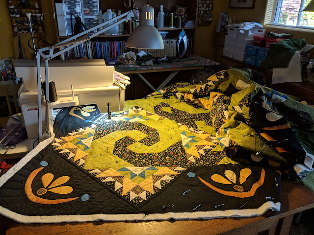 84 x 84 before quilting and washing, it was one of the larger quilts I've finished. My Janome 9400 QCP handled it well. I love the 11" harp space. I used Hobbs 80/20 for the batting. I spent a couple hours each day over about 2 weeks to get the quilting done. I chose 1" Cross hatching in the black printed areas. Stitch in the ditch around the block components. Medium sized swirls in green areas, and a mix of motifs in the block portions in the center. I decided to keep the borders simple, using a 1/2" bead design along with 1" piano key quilting.