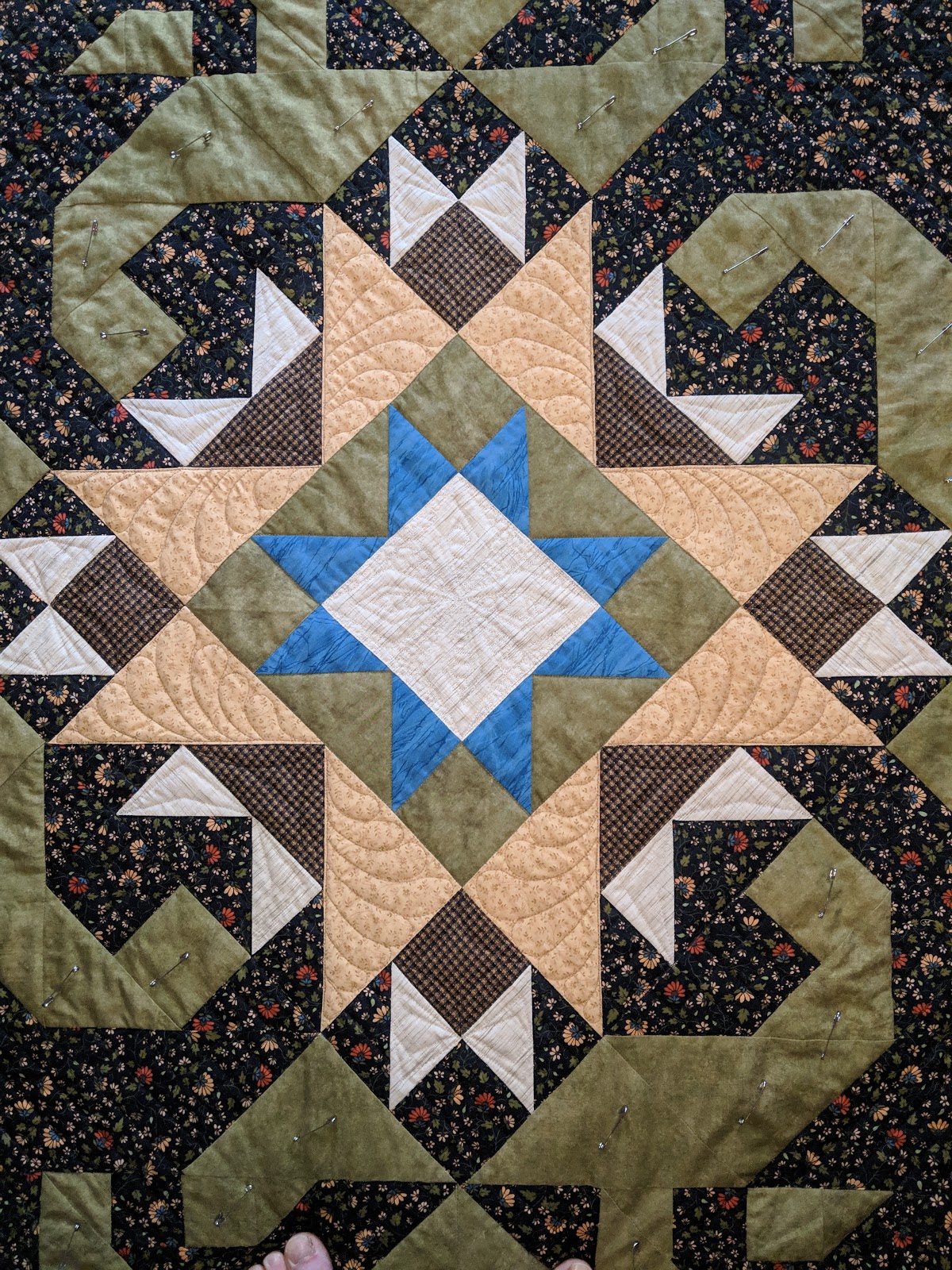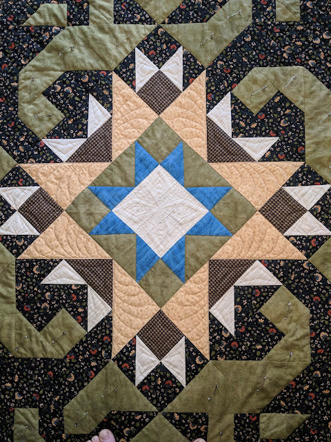 This is a going to the Corbett Windy Quilters Donations. I decided to quilt this one simply, using echo stitching in the center stars, and switchbacks to help hold down the outer designs. I used a wishbones motif in the sashings.