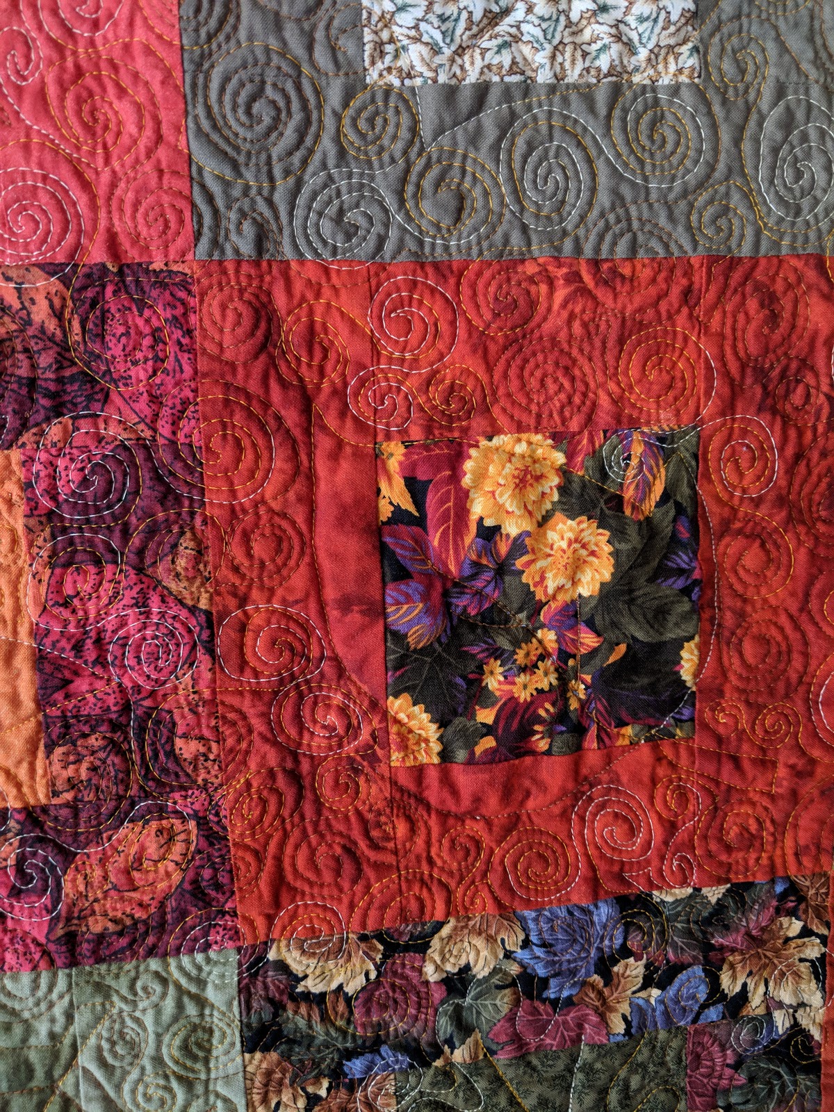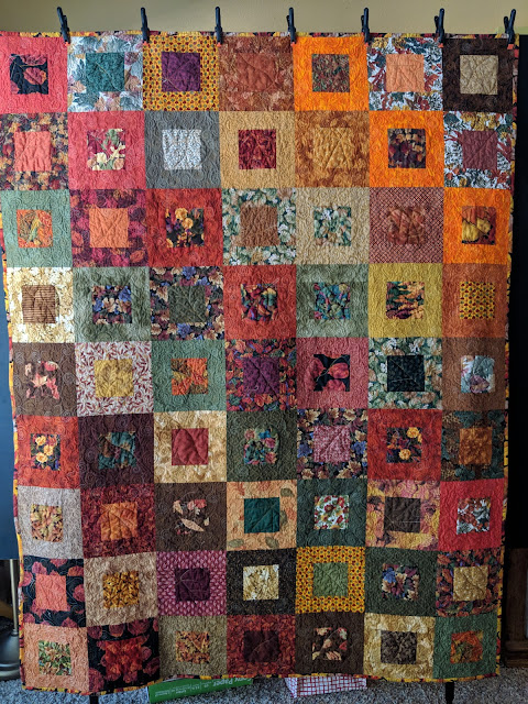 "Autumn Leaves" was my second finish for the month. This is another quilt that has been lurking in my "Needs Quilting Pile" for too long. These fun little "Happy Blocks" were some I won from an online quilting forum that I used to visit often, called Block Central. I made a whole bunch of quilty friends there before it went dark. We still keep in touch on a facebook group, but I think we all have so many blocks and projects from those previous exchanges and swaps that we don't really do that much any more.