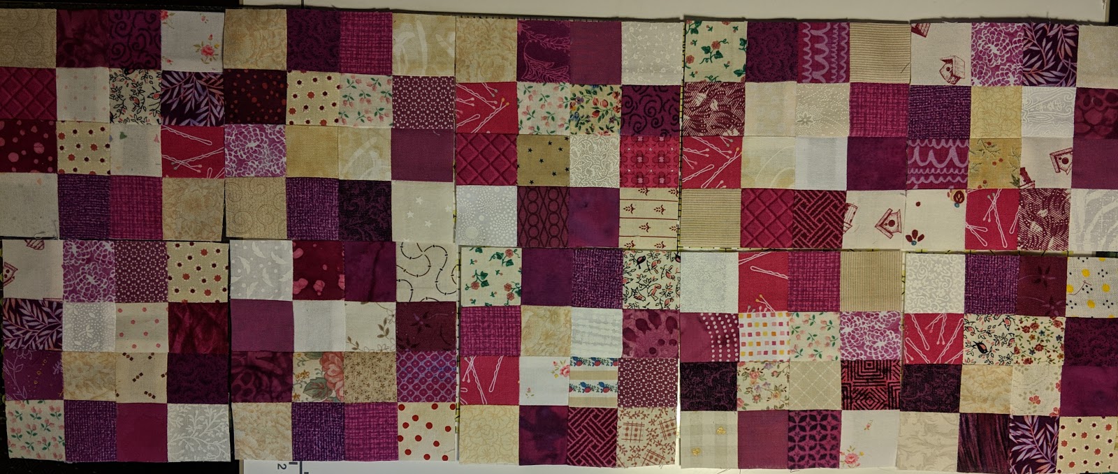I then went to work on clue # 7 This clue got us started piecing some of our earlier units together. One of our assignments was to stitch some of our clue #1 units together into 16 patches.