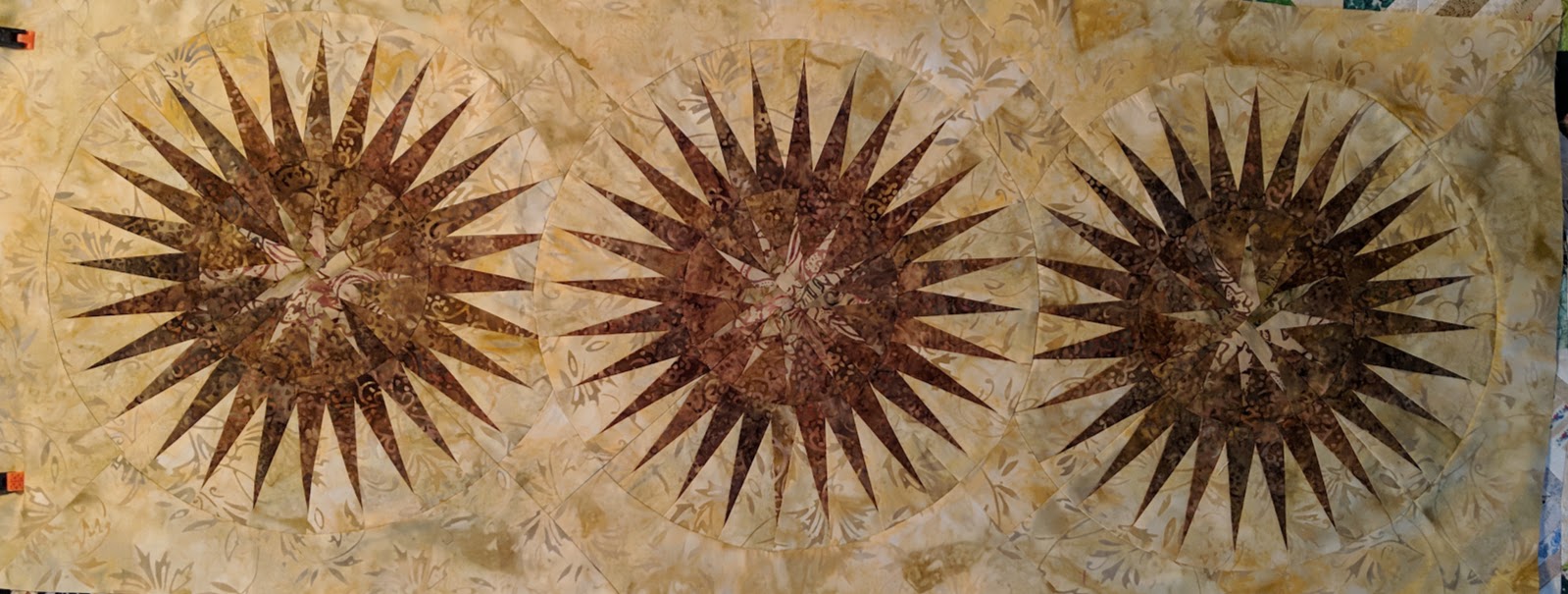 While I was waiting for clue # 6 to come out last week, I reached for an old unfinished project that I started in a class in 2010. Judy Niemeyer taught a class at our quilt show that year, and I still hadn't finished my table runner. I had seriously forgotten where I was in the process. Turns out that I had all the small paper pieced points done! Yahoo! I did need to locate the rest of my background fabric which had long ago been mixed in with my batiks. Thankfully, I hadn't used it on another project!