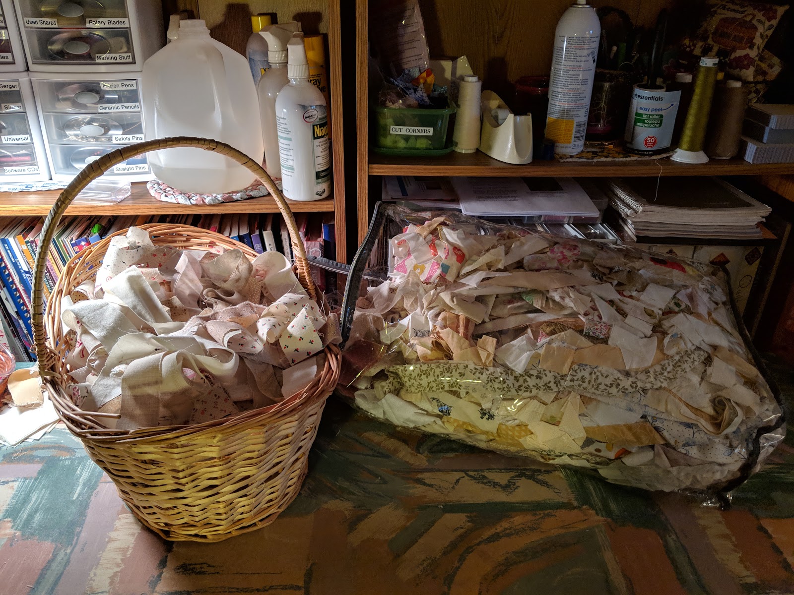 I pressed several different strips and placed them in a basket to pull from as I worked. The basket is full, and my string bag is still busting at the seams. These things multiply!