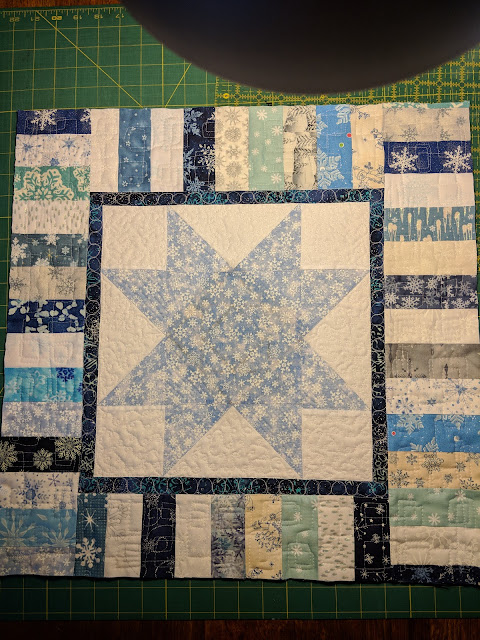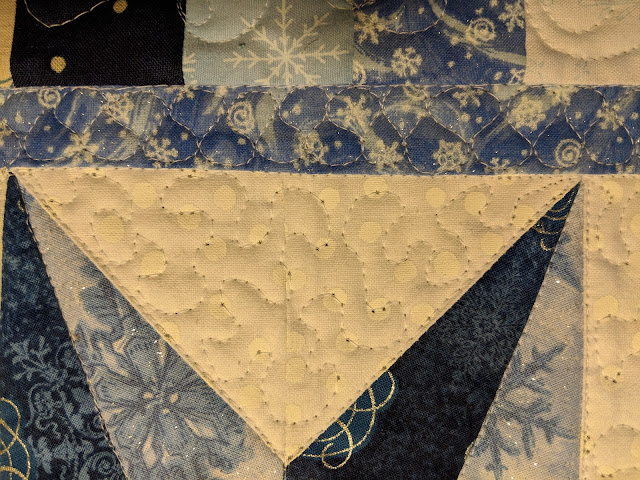 I decided to start out with two little snow fabric table toppers, that were made with pieces left over from Warm Winter Wishes, that I finished up in December. It didn't take long at all to quilt these two little gems. Besides, it was snowed that day... just seemed right to work on them.
