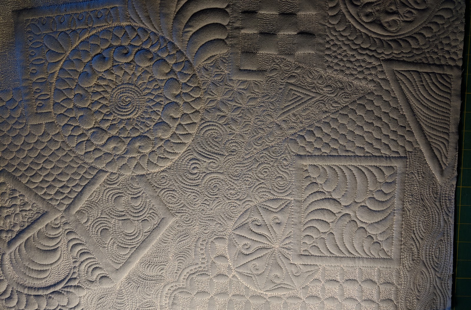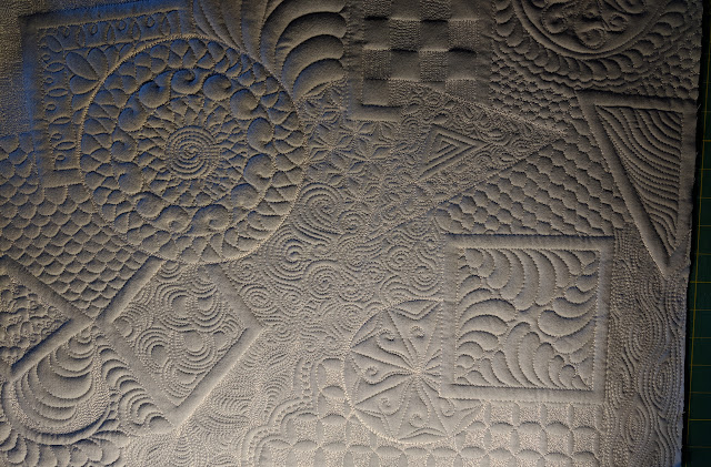 I chose to use a variety of geometric shapes, surrounded by a variety of background fills. I'm calling it "Shapes I", as I see a series of these in my future. I used a soft gray shot cotton on top, 80/20 Hobbs batting plus a layer of wool batting, and quilted it with a soft gray Glide Thread. I'm very happy with how it turned out.