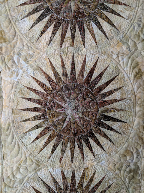 I had entered my "On Ringo Lake" Bonnie Hunter Mystery in our show... so it was definitely on my " to do" list for March. I actually did this one on a long arm, with help and assistance from a member of our guild who does Long Arm finishing on many of our Quilts of Valor. We chose an overall design and in about 4 hours, I was on my way home.