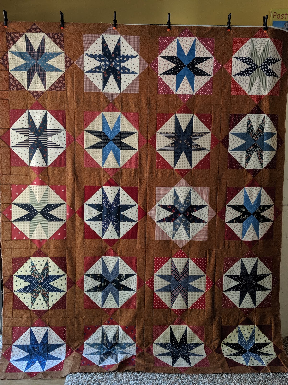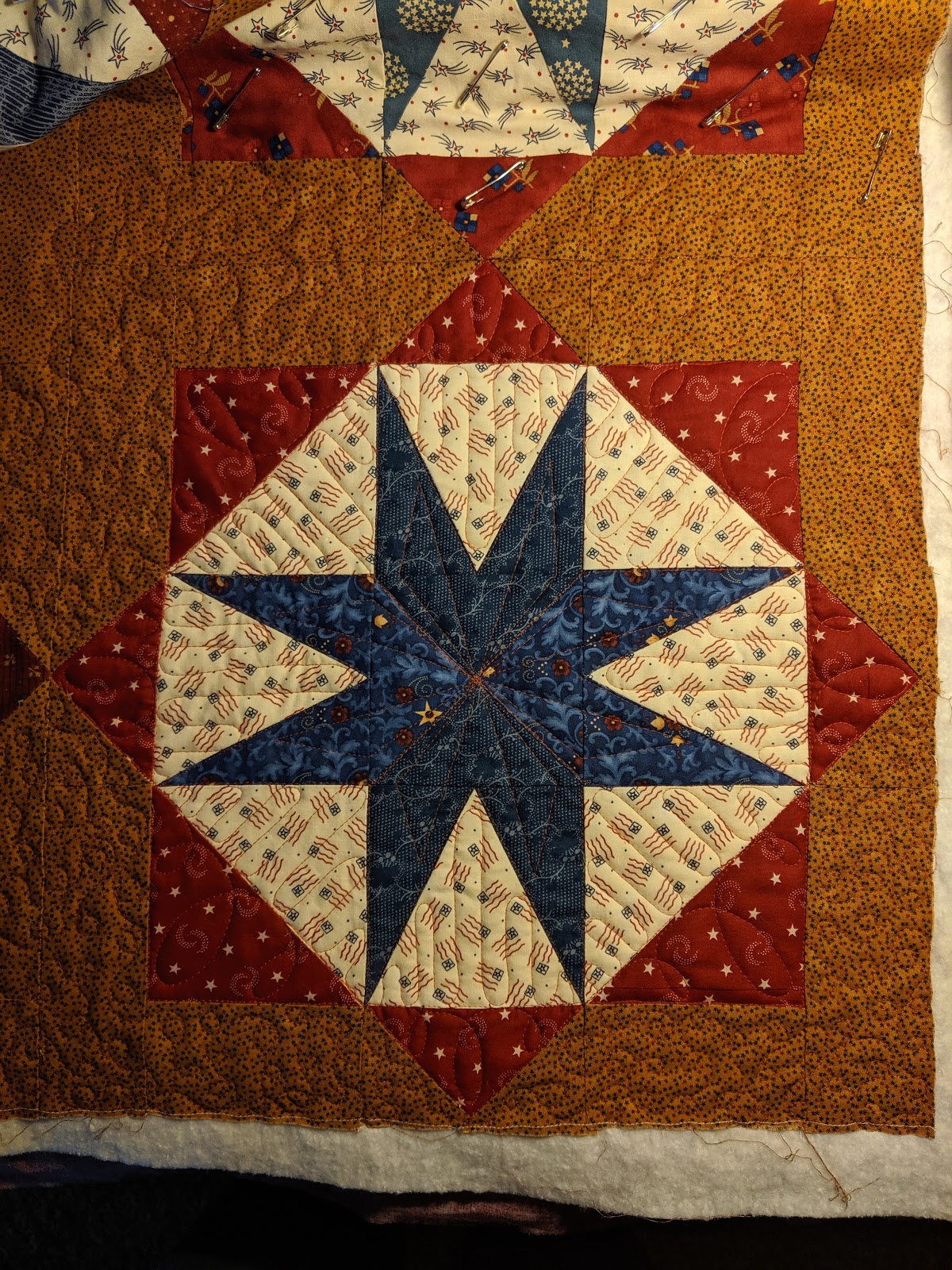 My friend and quilting mentor, HollyAnne Knight over at the String & Story, had a summer quilt along. The pattern was her "Star Island". I chose to do it in darker Americana colors so it can be a Quilt of Valor.