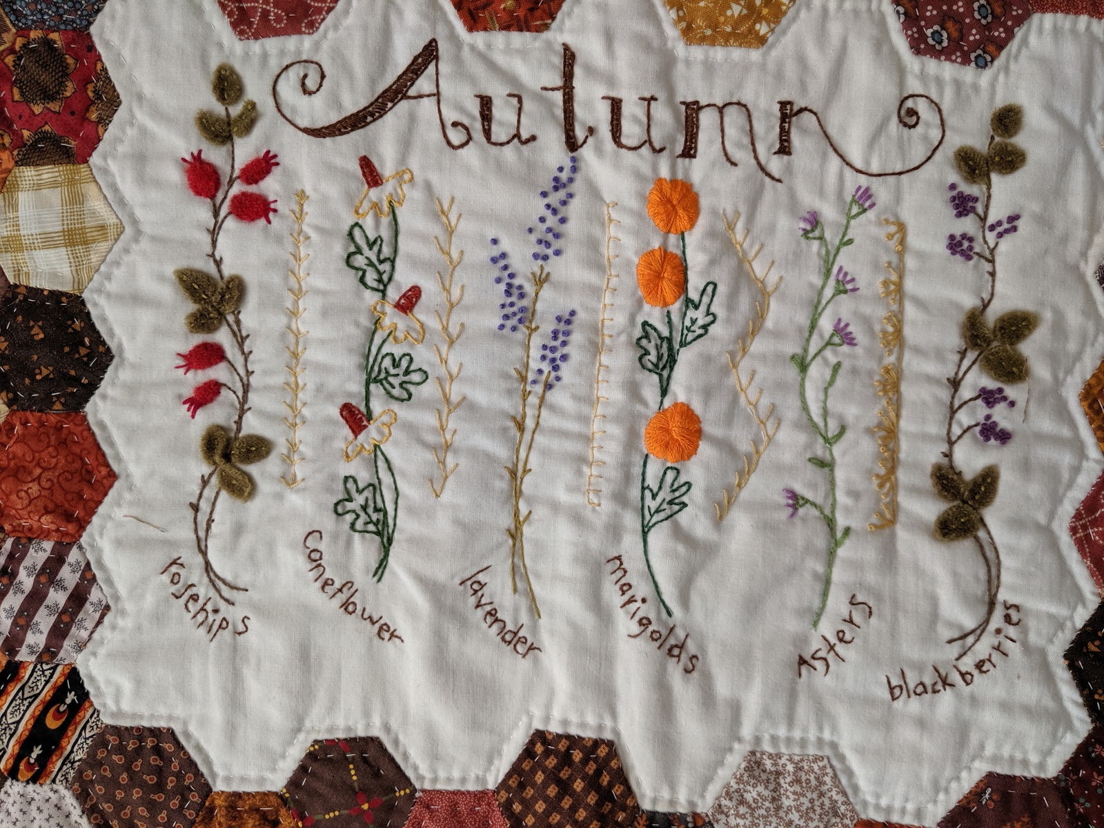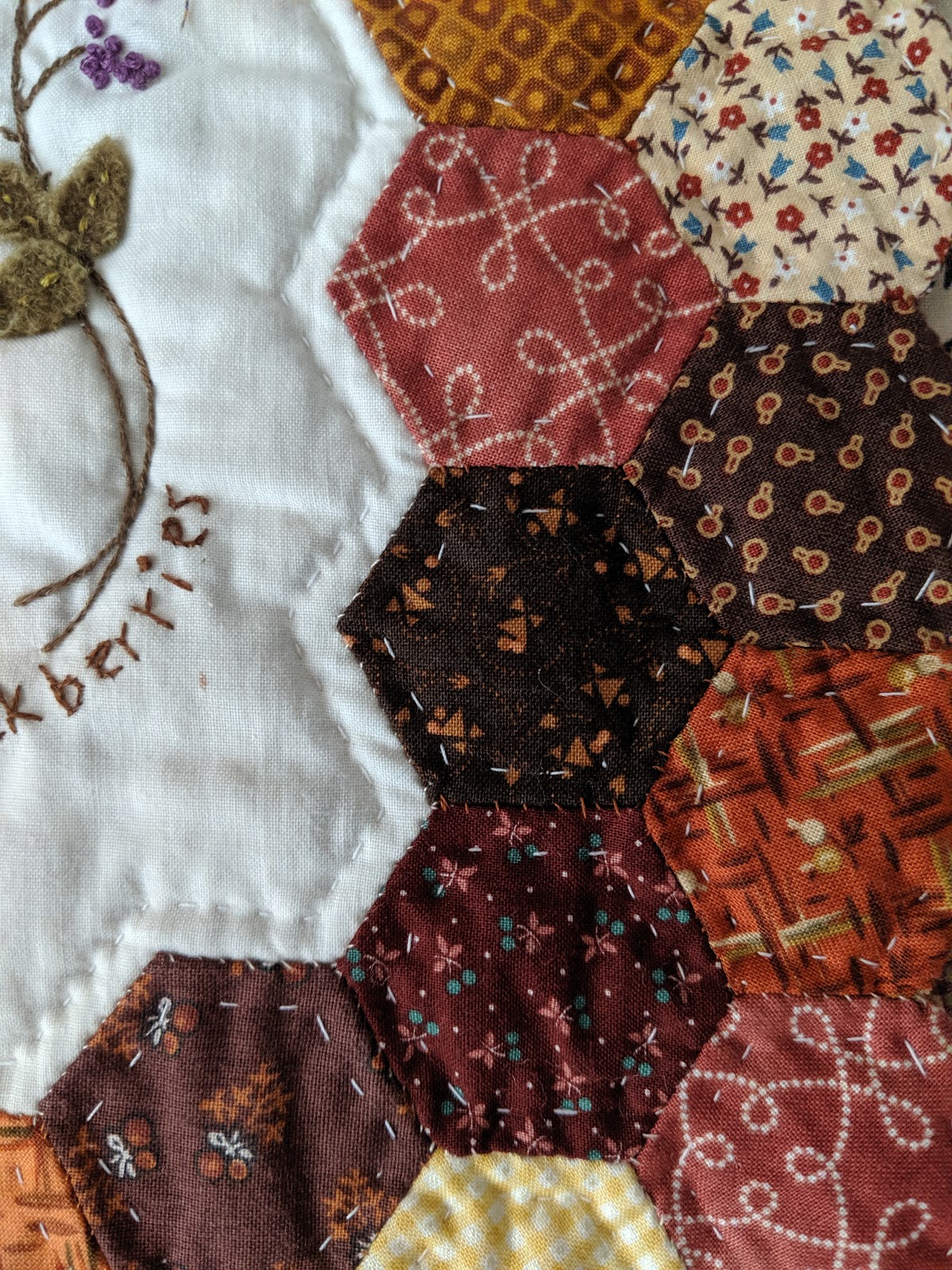 This Autumn Hexies - The first one I finished in the series. I stitched the hexies together by hand on the border and hand quilted it.