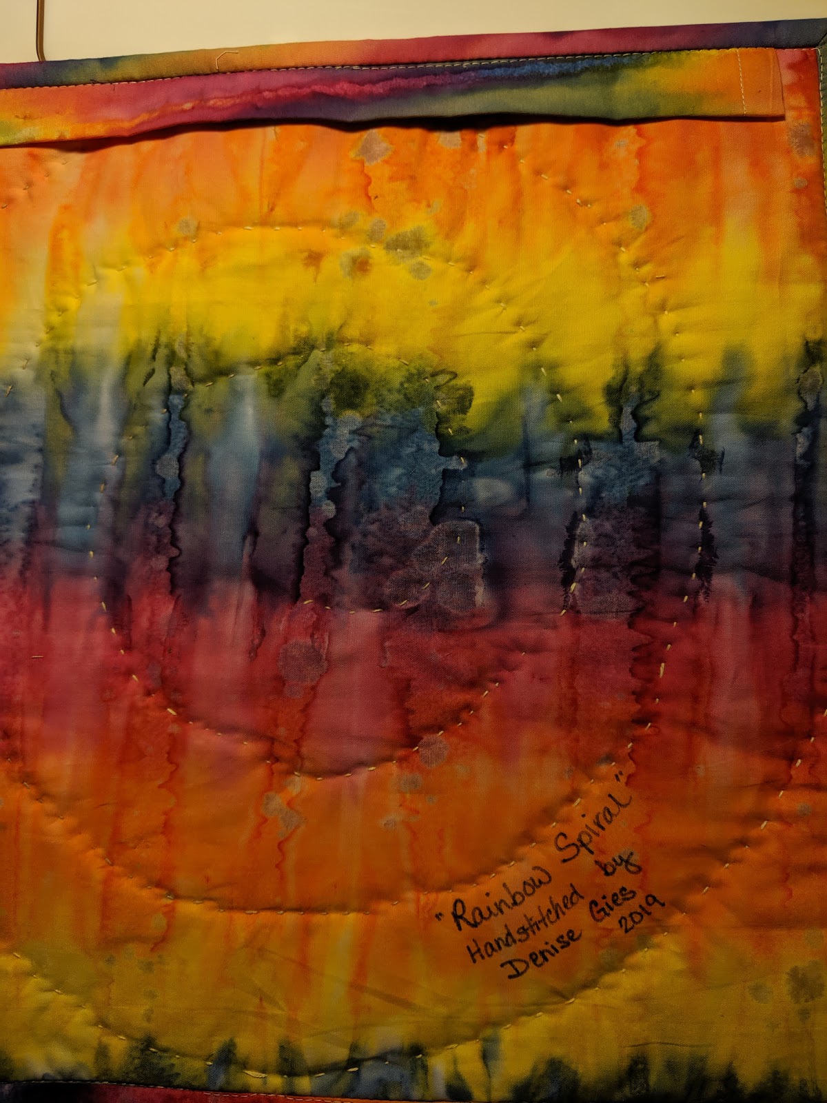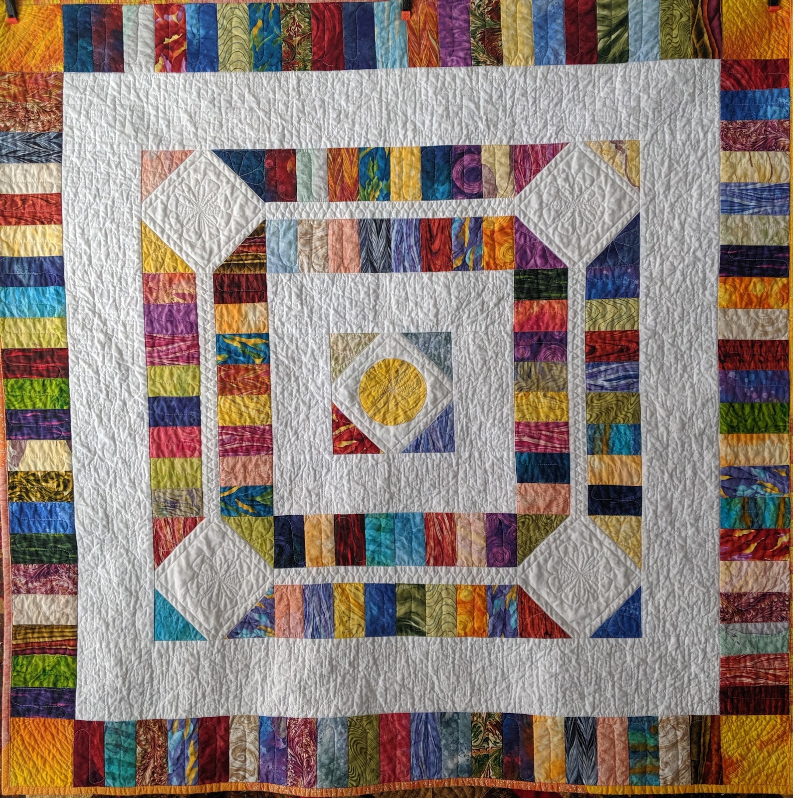 For the Summer project, I used a baggie of tiny corner triangles that were gifted to me from a friend. The colors were perfect! I machine quilted this one because there were so many seams in the pinwheel borders.