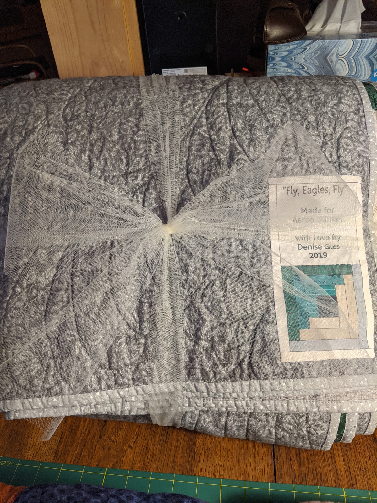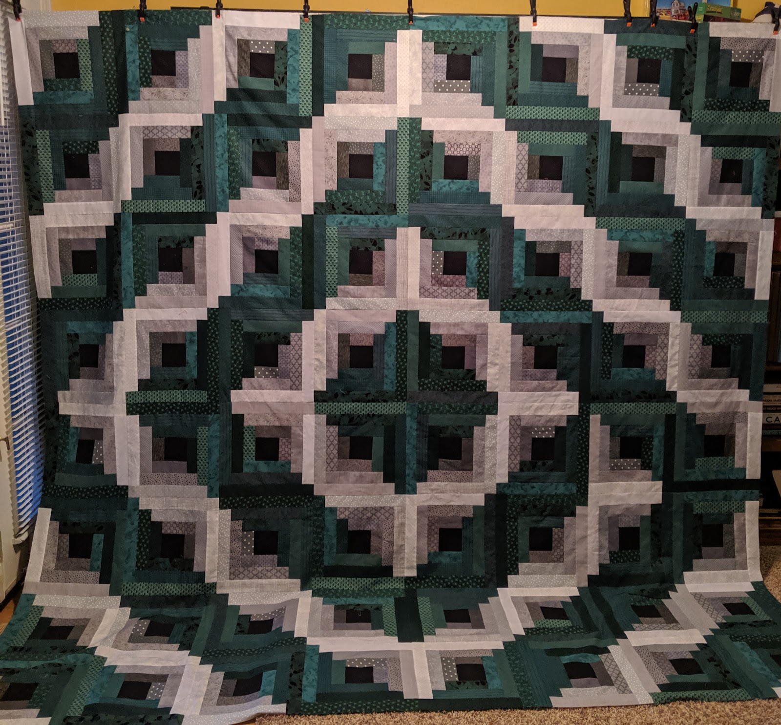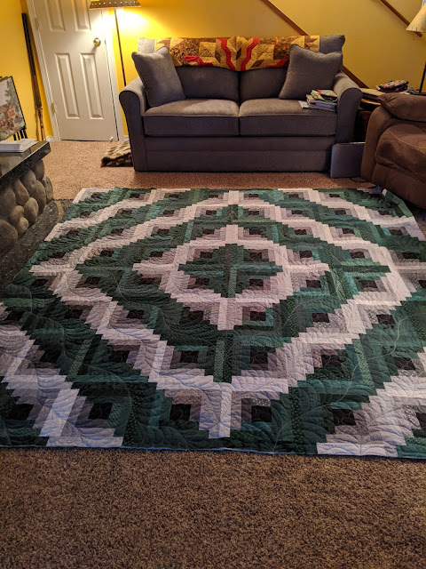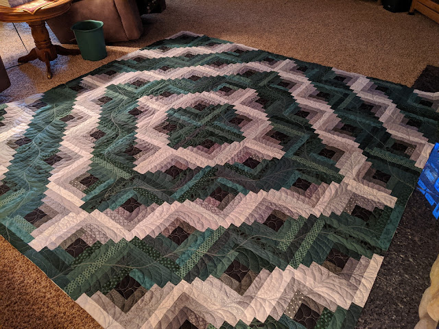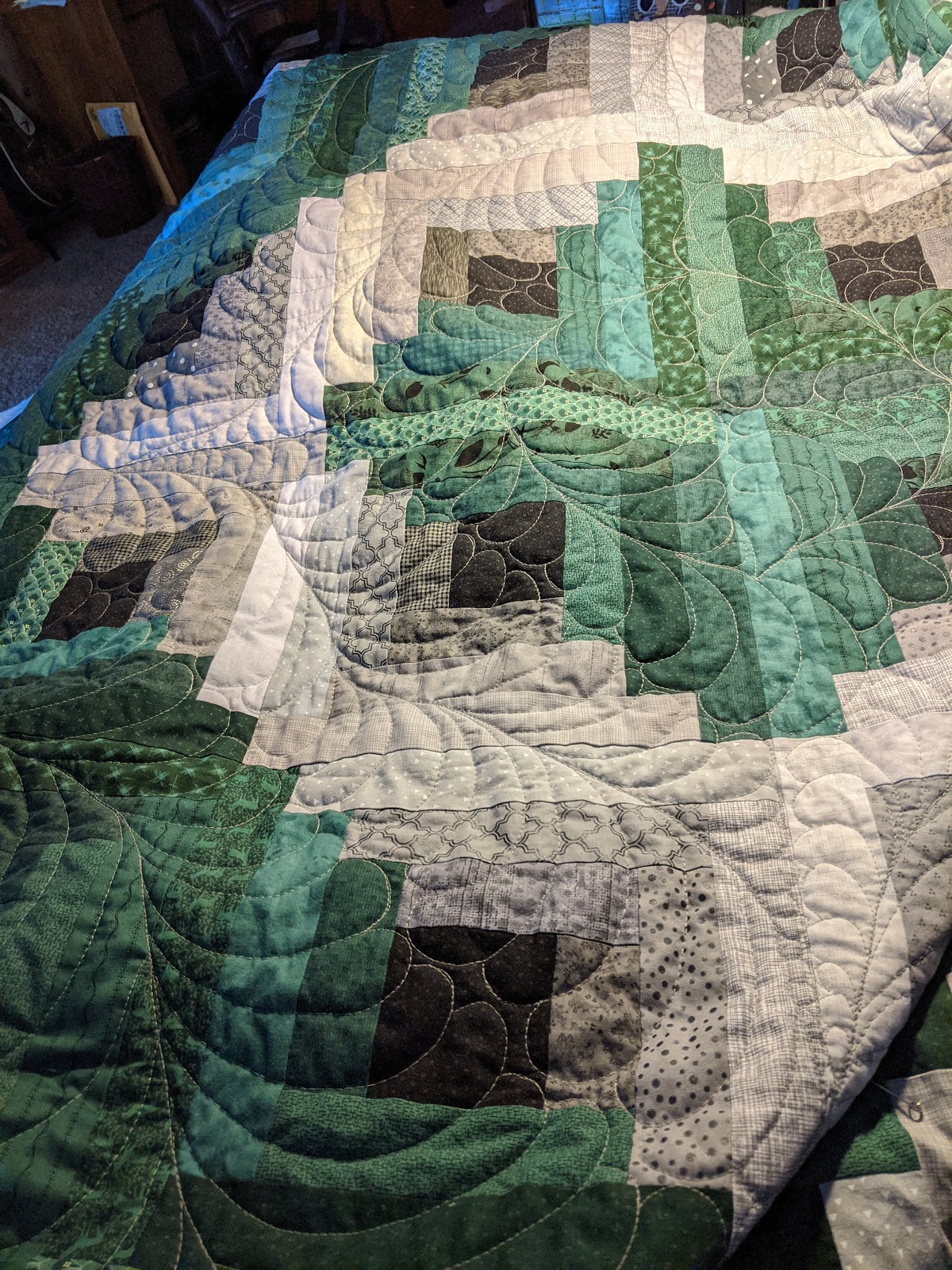 Aaron graduated last December and he has moved across country to Nashville Tennessee. A Philadelphia Eagle Fan, it only made sense to use team colors for him as well. I decided on a log cabin quilt. When it came to quilting, feathers were a definite decision! "Fly, Eagles, Fly!" this is 95" x 95", because I cut my strips too large... LOL