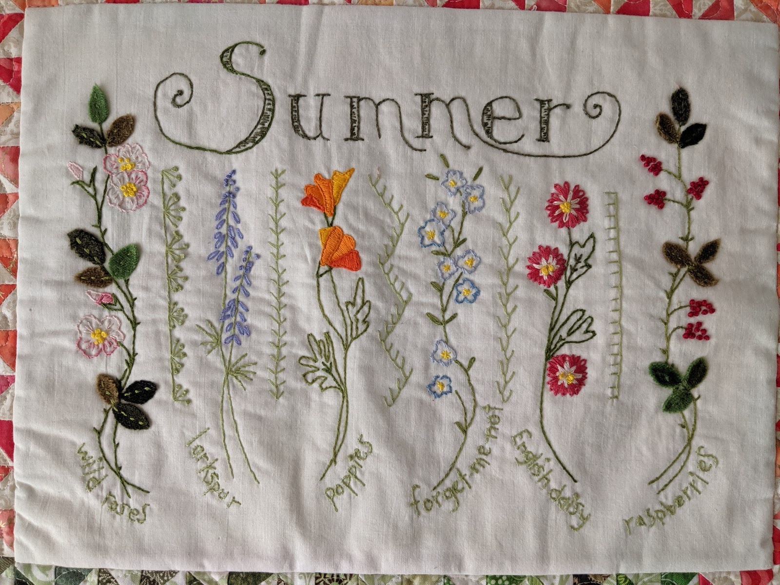 The Winter project is one that I had finished the embroidery on several years ago. I had even started to make the wonky crumb scrap borders. They needed to attached. I hand quilted this one.