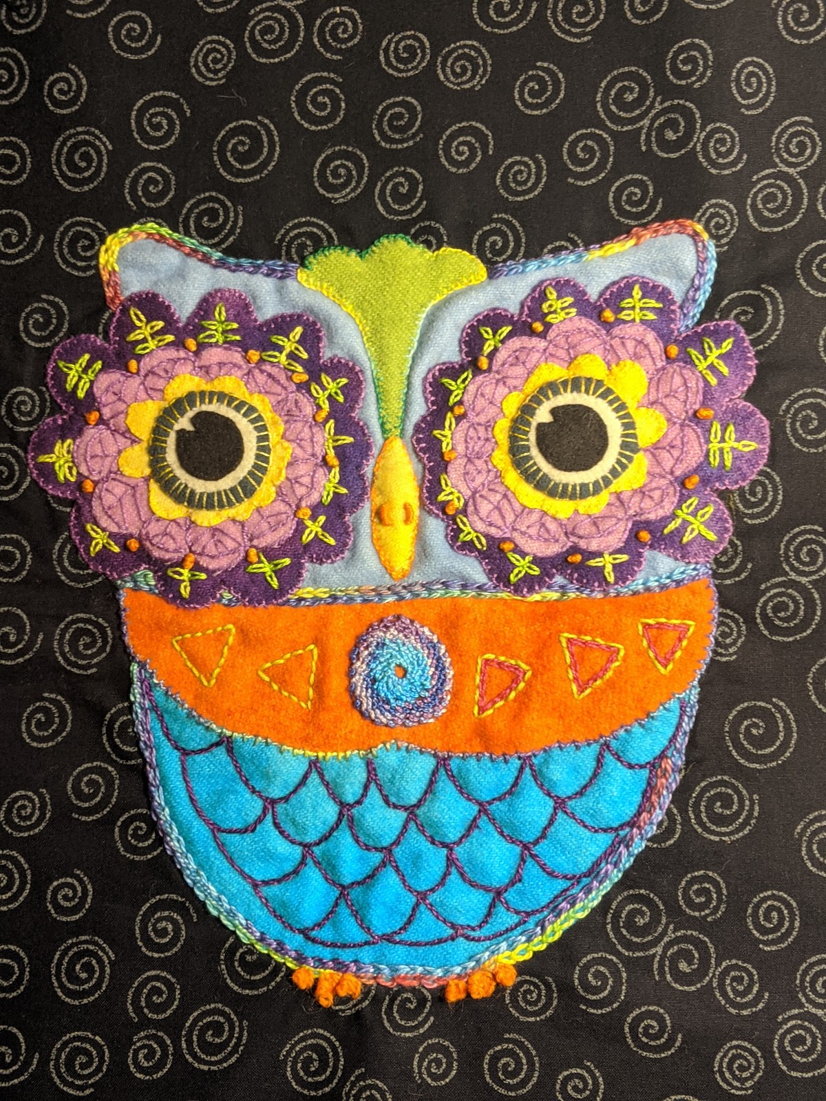I found some Japanese Cotton at a quilt show this fall and wanted to try some wool on that. This project will become a tote bag. One side with the bright squares the other with the owl. The owl inspiration came from an adult coloring book that was given to me when I retired. I'm nearly done with the owl side, and then it can be finished.