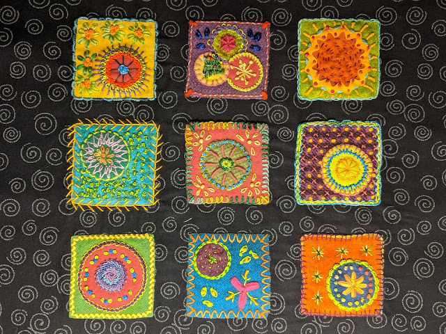 After finishing "Rainbow Spiral", I couldn't stop playing with stitches and thread... so I started an autumnal leaf project using 3" squares so that I could practice some linear stitches that were difficult to try on those 1-1/4" circles.