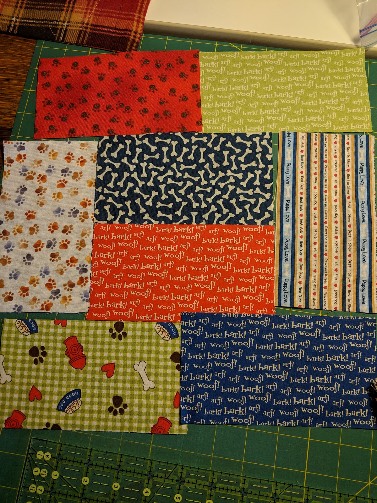 Several years ago, I made a quilt for an auction to benefit Guide Dogs for the Blind. I had fabric left over, of course. This will also be a One Block Wonder Quilt and is already cut into the bricks. The extra fabric will be used on the back and for borders.