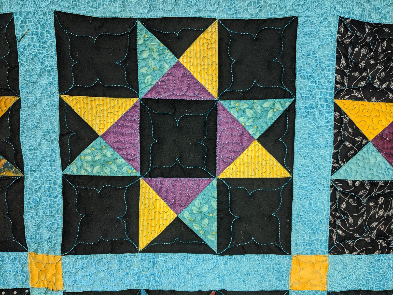 This project took about 12 hours, but that was the assembly, sandwiching, quilting and binding. My 9 blocks were already pieced back in 2013. I think the turquoise sashing with gold cornerstones was the perfect setting for this Donation lap quilt that finished at 43 x 43". This is going to our guild's Comforting Quilts Project.
