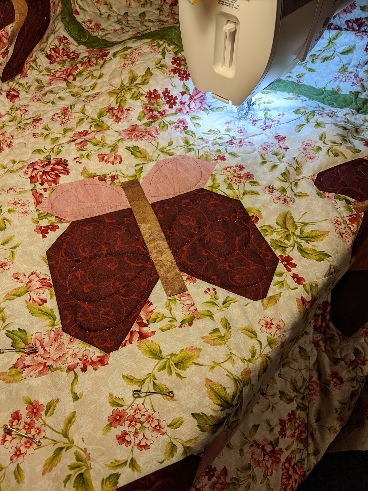Note- It's now the 14th of the month and time to get this sandwiched. My plan at this point is to use a large double loopy meander in the background. With all those flowers, I can't see the need to do anything fancy or fussy. I'm also thinking that I'll use some half feathers in the butterfly wings. I'm not treating the little green border as a border, rather as a focal break but it will be quilted same as the floral background. 1/14/2020 - I used low loft poly batting on this one - Warm Company's Soft and Bright.
