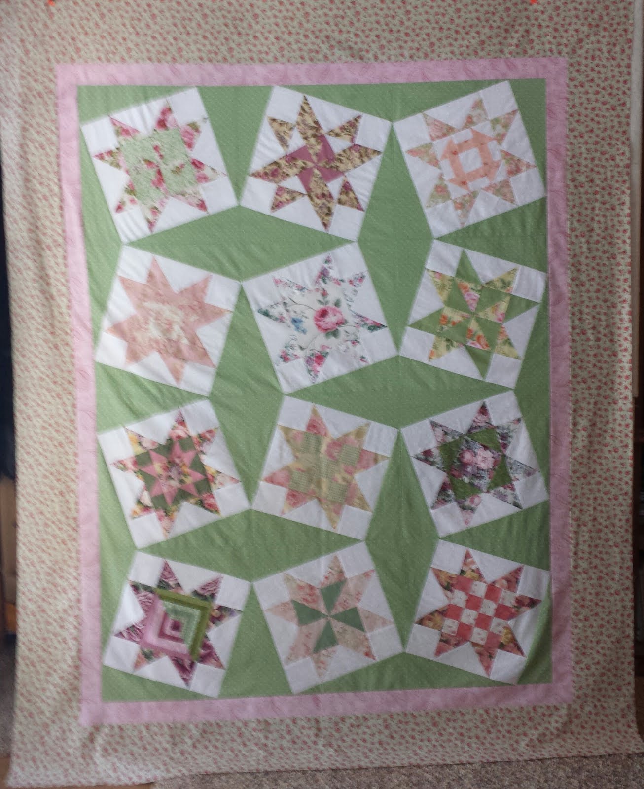 I was those block of the month chair for our guild for several years. This is the result of the blocks from 2012. Our theme that year was Variations on the Variable stars. I chose to do my blocks in old roses and soft color combinations. It is ready for quilting.