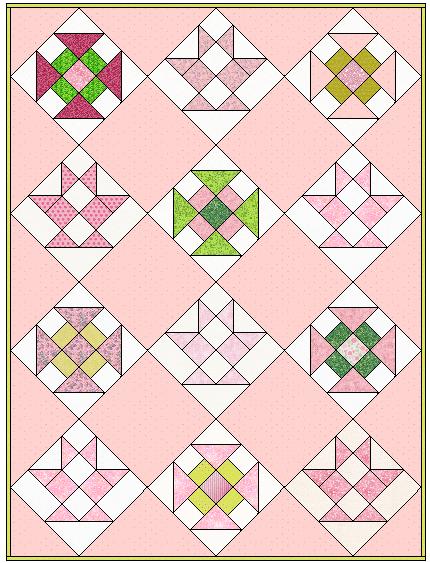 These blocks were from an internet exchange we did. I thought the pink with green dots was perfect for setting them together. I used EQ software for the setting idea. Ready for quilting. this is approx 58 x 68 The blocks are a mix from two different exchanges