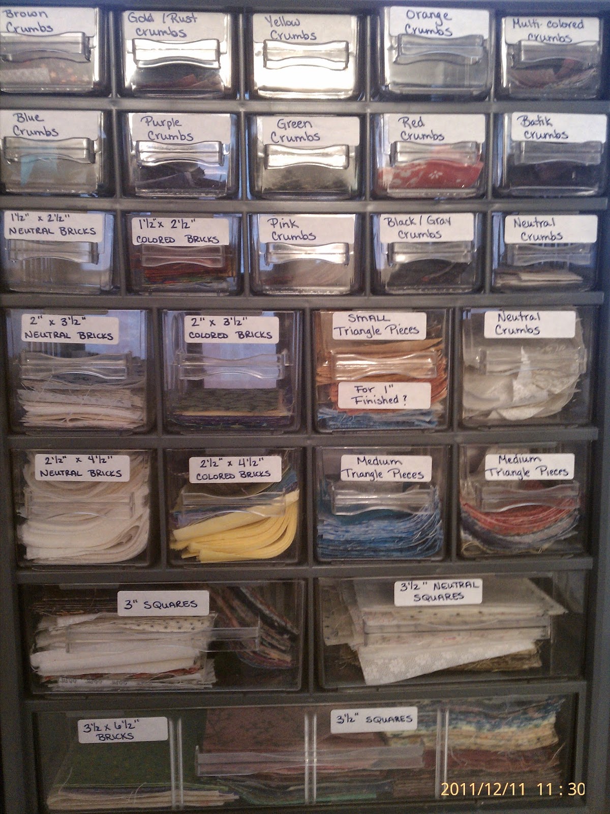 I'll post a list at the end of this tutorial of how I separate the fabric... but mostly they are by color, or size of strips.