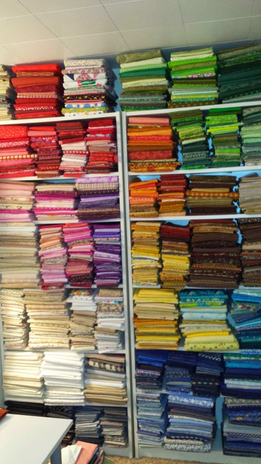 notice the two sizes of blue fabric stacked in this picture. They fit on a 12" wide shelf nicely this way.