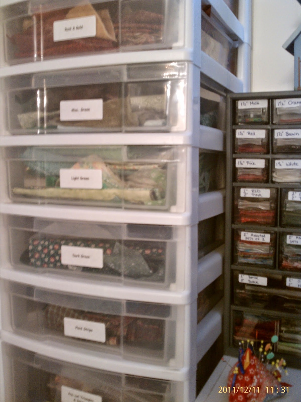 These are my three green drawers.... when one gets full, I sort through it, and cut the smaller pieces, or the oldest pieces down into strips, squares, or bricks....