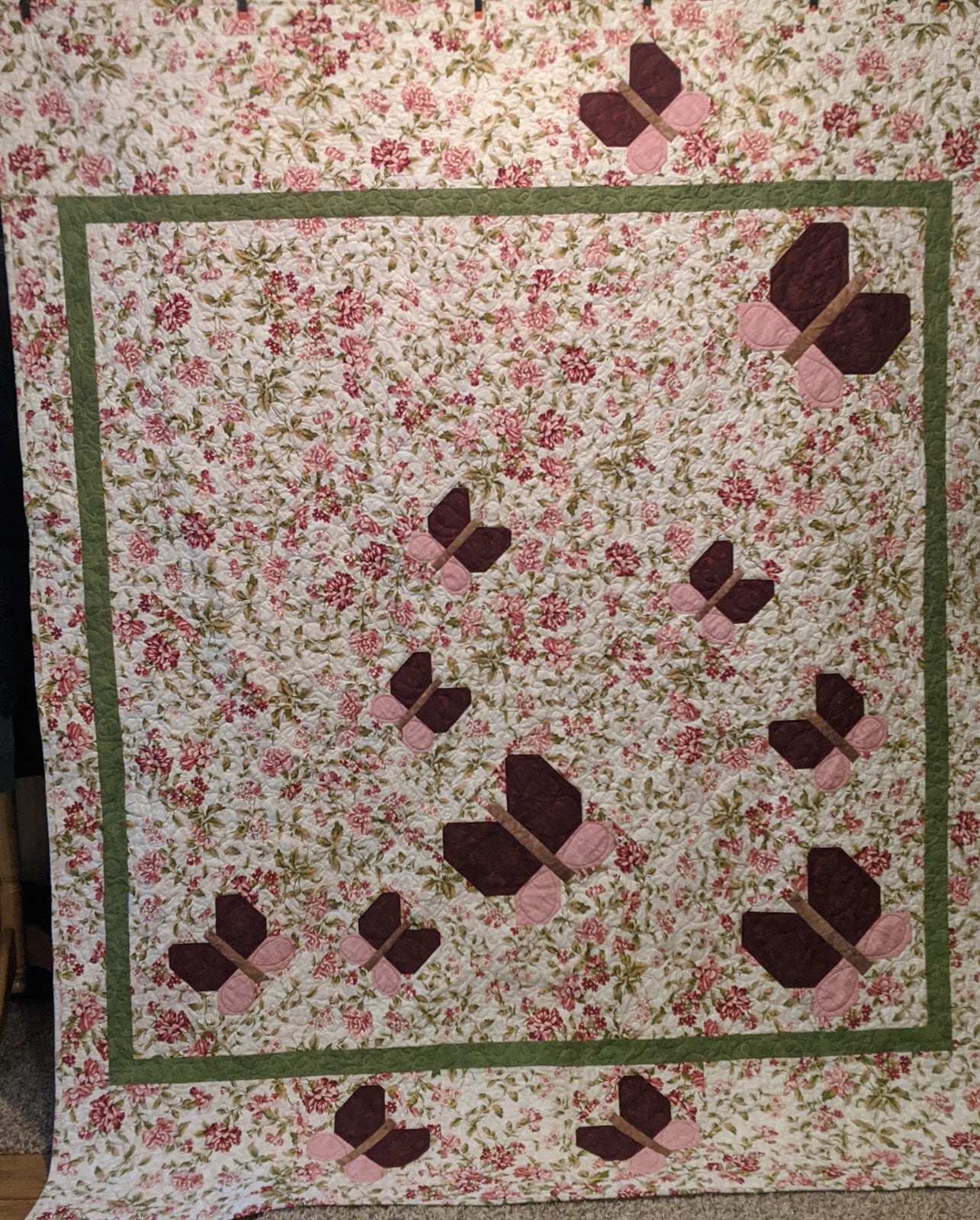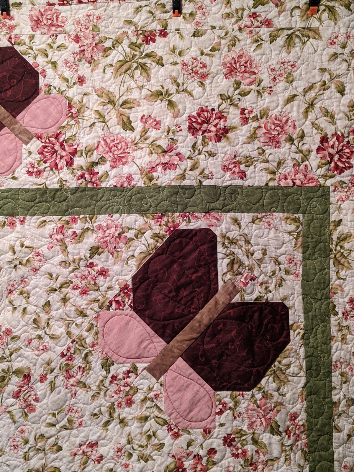 Note- It's now the 14th of the month and time to get this sandwiched. My plan at this point is to use a large double loopy meander in the background. With all those flowers, I can't see the need to do anything fancy or fussy. I'm also thinking that I'll use some half feathers in the butterfly wings. I'm not treating the little green border as a border, rather as a focal break but it will be quilted same as the floral background. 1/14/2020 - I used low loft poly batting on this one - Warm Company's Soft and Bright.
